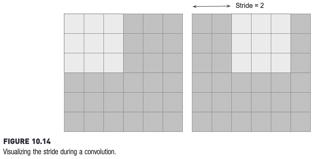 Ketika menghitung konvolusi, filter selalu digeser. Pergeseran filter ini sebenarnya tidak harus satu langkah. Bisa saja, misalnya, dua langkah. Banyaknya langkah ini disebut stride.